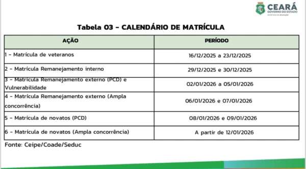 A Secretaria da Educação do Ceará (Seduc) divulgou, nesta quarta-feira (19/11), no Diário Oficial do Estado, a Portaria de Matrícula referente ao ano letivo de 2026. O documento define as normas e orientações gerais para o ingresso e a renovação de estudantes nos estabelecimentos de ensino da rede pública estadual.